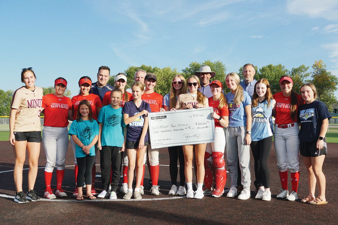Ryan Ladika/MDN Members of the local softball community, including players from Minot High School and Minot State, gathered at South Hill Softball Complex Wednesday evening to accept a $100,000 donation from Dacotah Bank geared toward future upgrades and enhancements to the complex.