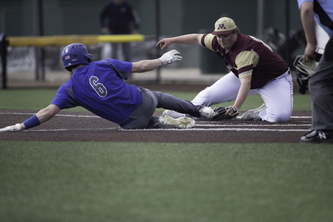 Adam Papin/MDN Minot pitcher Tyler Buchanan tags out St. Mary’s Connor Schatz (6) as he tries to steal home on a passed ball in the first inning of game one of Tuesday night’s doubleheader.