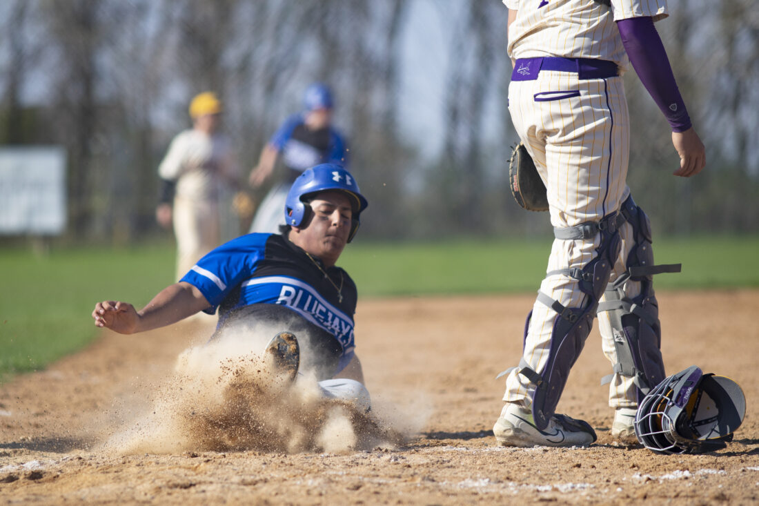 Adam Papin/MDN - Stanley third baseman James Fierros Fonseca slides home ahead of the pickoff throw in the top of the sixth inning.