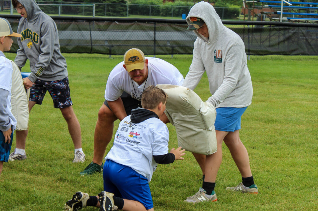 Sean Williams/MDN Cordell Volson going through a drill with a camper at the Harvey/Wells County Central Dakota Football Camp on Friday at LC Loerch Field.