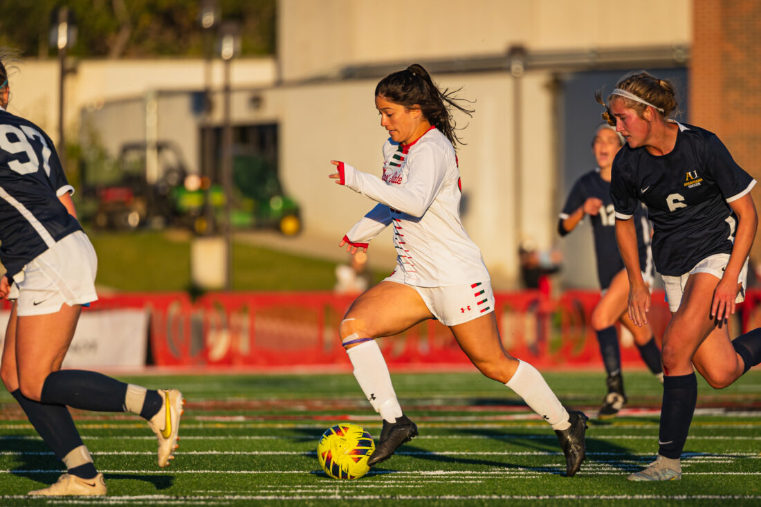 - Minot State’s Anabel Noches weaves through defenders during a game from the 2022 season.