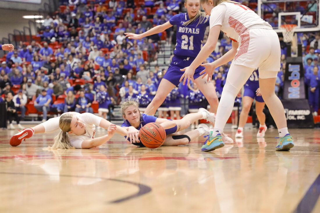 South Prairie-Max’s Rylee Routledge dives for a loose ball amid a swarm of Devils Lake players during the first half of the 2024 NDHSAA DIvision A Girls Basketball State Championship game Saturday.