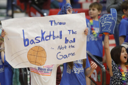 - A young fan holds up a sign encouraging the South Prairie-Max girls basketball team ahead of the Royals’ quarterfinal matchup against Shiloh Christian.