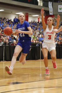 - Skotti Beck, of South Prairie-Max, drives past Devils Lake’s Gabrielle McLaurin during the first quarter of the Division A state title game on Saturday.