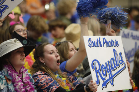 - Members of the student section from South Prairie and Max high schools cheer on the Royals’ girls basketball team, as it makes its state tournament debut against Shiloh Christian on Thursday.