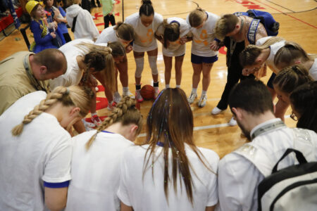 - The South Prairie-Max girls basketball team prays together before taking the court for its state semifinal matchup with Thomspon during the 2024 NDHSAA Division A Girls Basketball State Championships on Friday.
