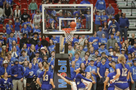 - South Prairie-Max’s Azijah Trader, along with the Royals’ student section, watches to see if her layup finds the basket during the second half of the state title game against the Devils Lake Firebirds.