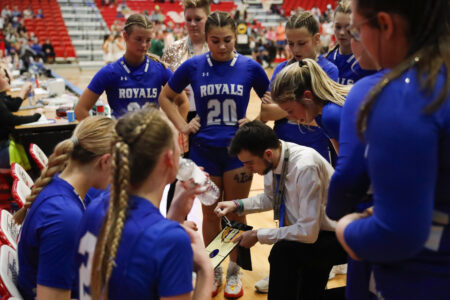 - South Prairie-Max’s Myah Rau leads the Royals’ reserves on to the court prior to the 2024 NDHSAA Division A Girls Basketball State Championship game on Saturday.