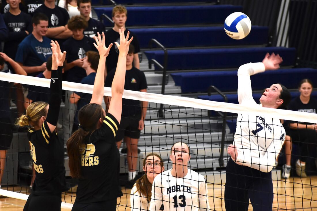 Kari Gibb/MDN Minot North senior Cadence Shipman (7) attacks the net while sophomore Brynn Francis (13) watches the WDA action as the Sentinels hosted the Bismarck Legacy Sabers Thursday, September 26, at Minot North high school.