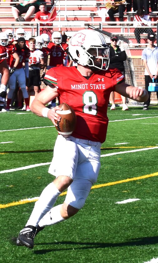 Kari Gibb/MDN MSU junior Carson Chrisman (8) scrambles for a score in action earlier this season. The MSU Beavers are on the road this week to face the ‘other Beavers’ in Minnesota on Saturday, October 26.