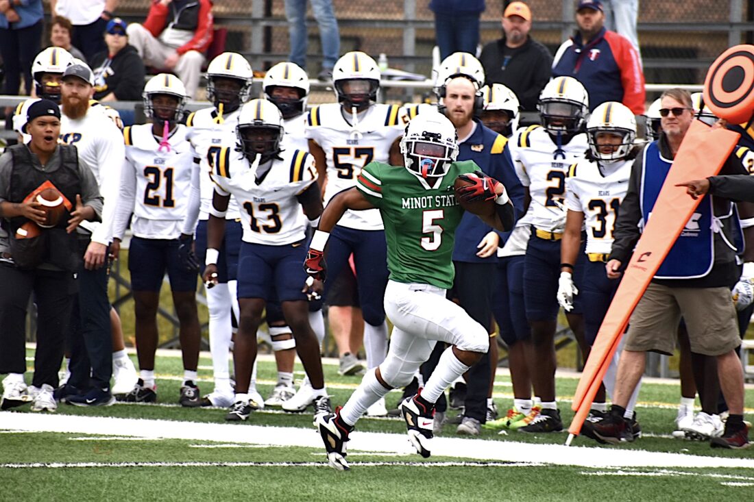 Nathan Beitler/MDN Minot State sophomore Devan Daniels runs the ball down the field at Herb Parker Stadium at the Beavers’ homecoming game against Concordia-St. Paul.