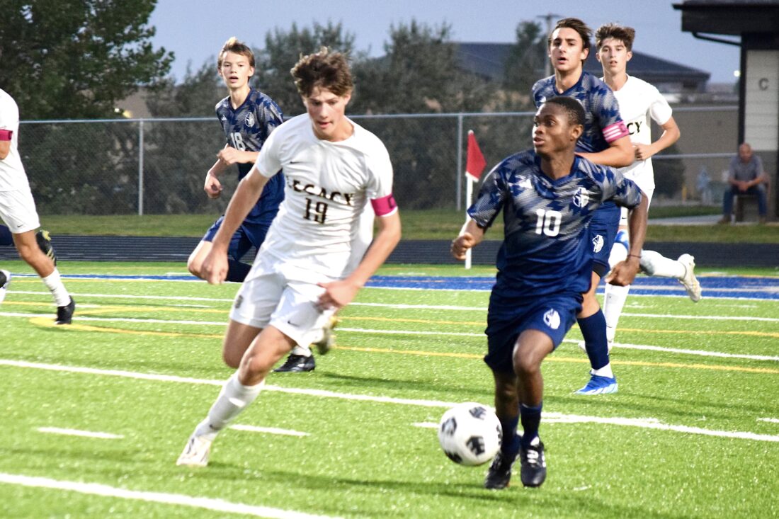 Mike Kraft/MDN Senior forward Moses Conteh looks to push the ball upfield as Legacy’s Kellen Okerson defends during a game at Sentinel Stadium on Tuesday, Sept. 16.