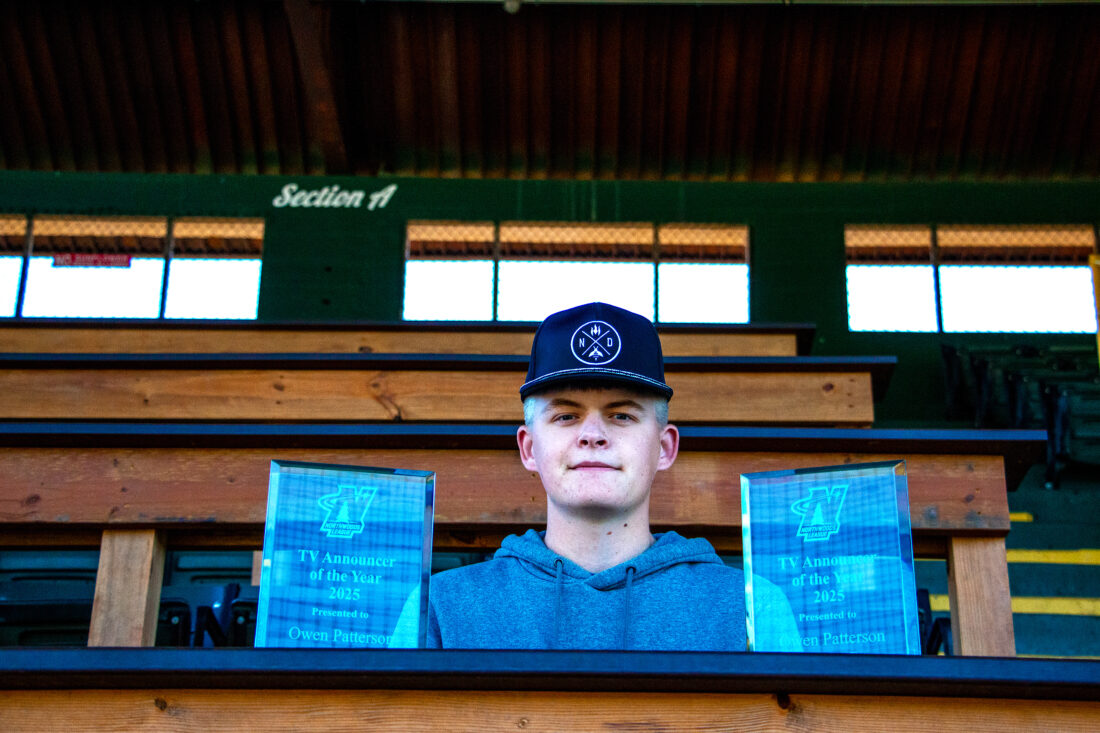 Submitted Photo Owen Patterson was named both the 2025 Northwood League Baseball TV Announcer of the Year and Softball TV Announcer of the Year for his work broadcasting Minot Hot Tots and Honeybees games this season. Photo provided by the Minot Hot Tots.