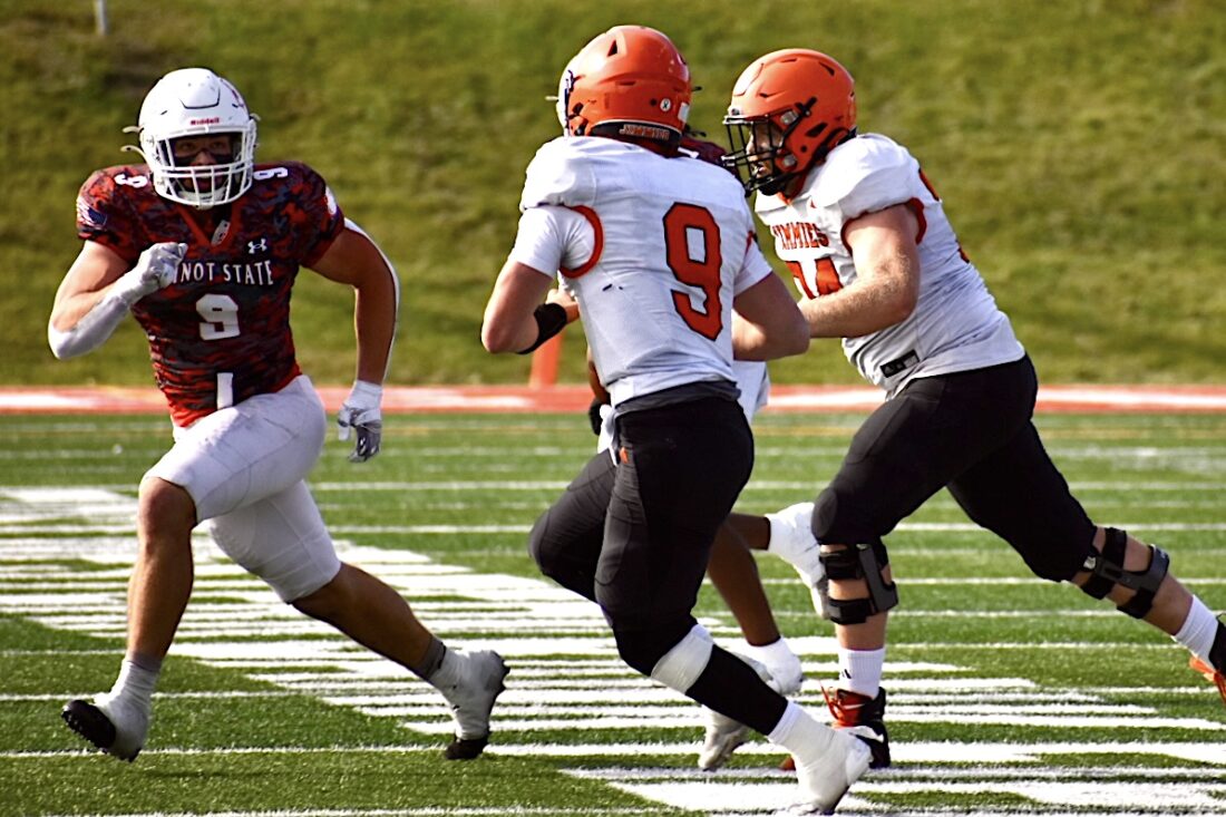 Nathan Beitler/MDN Redshirt junior defensive end Cody Grossinger runs in the path of the University of Jamestown Jimmies’ carrier in their home game victory on Saturday, Oct. 11.