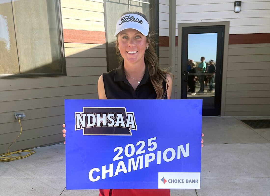 Class B girls’ golf has a back-to-back state medalist in Des Lacs-Burlington junior Laila Christianson, who successfully defended her medalist title on Tuesday, September 30 when she took home first place in the 2025 NDHSAA Class B Girls Golf State Tournament.