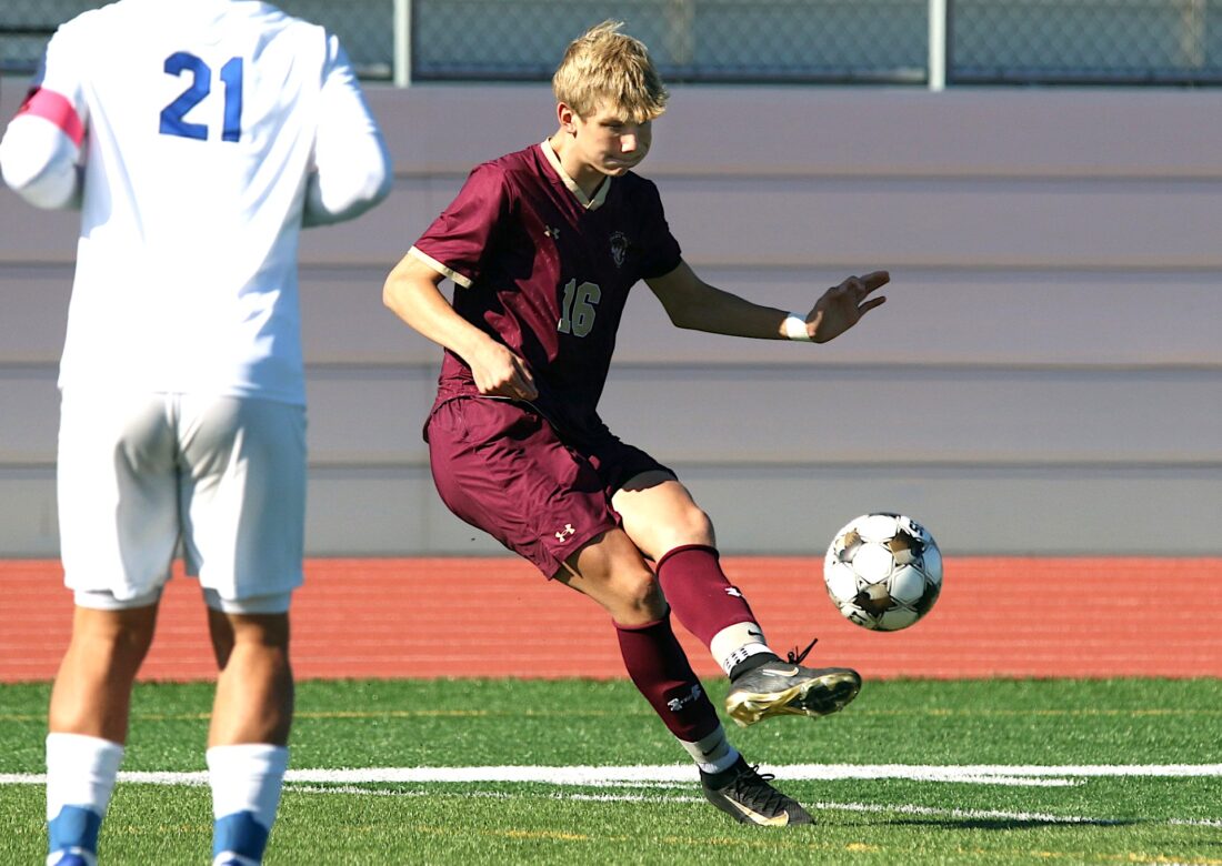 Submitted Photo Minot High junior Dylan Oswalt takes a free kick in the consolation semifinals against Jamestown on Friday, Oct. 17. Photo by Michael Linnell
