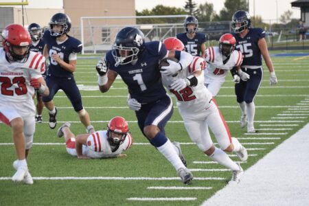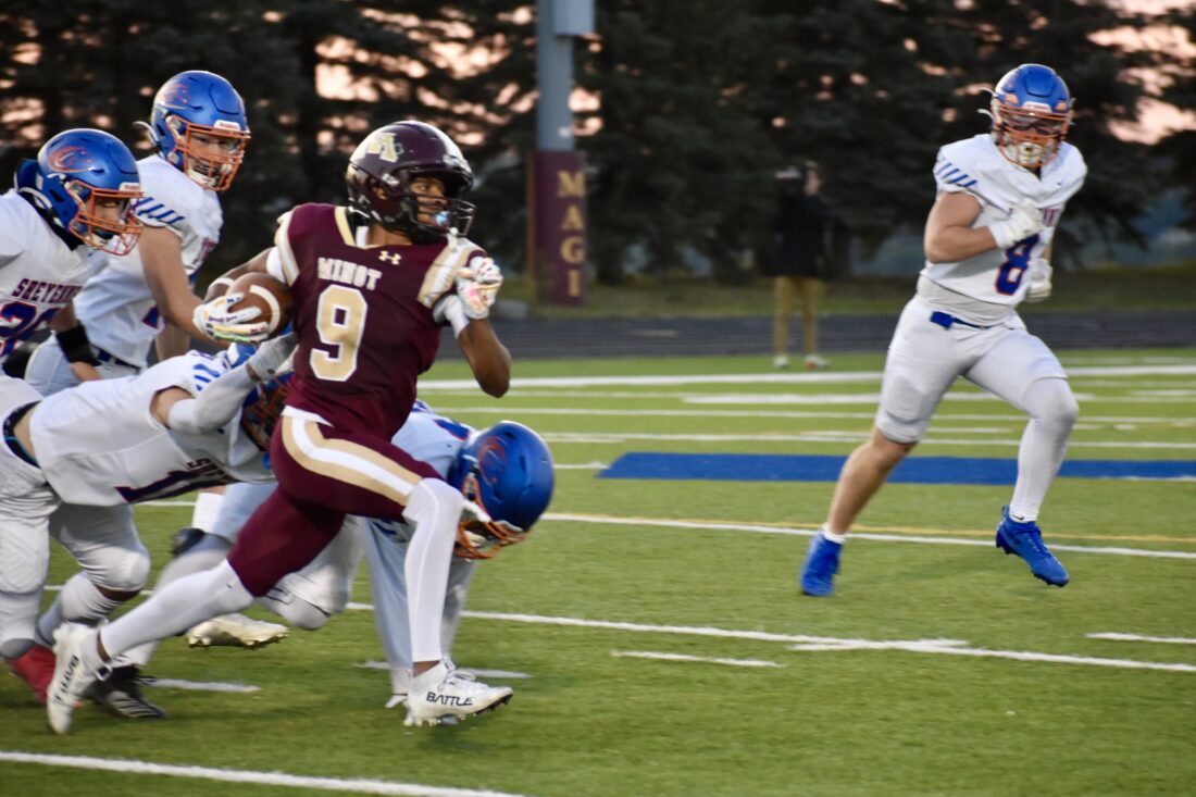 Mike Kraft/MDN Minot High wide receiver Tariq Bell runs the ball down the field, shaking off defenders in Magi’s home game against West Fargo Sheyenne on Friday, Sept. 5.