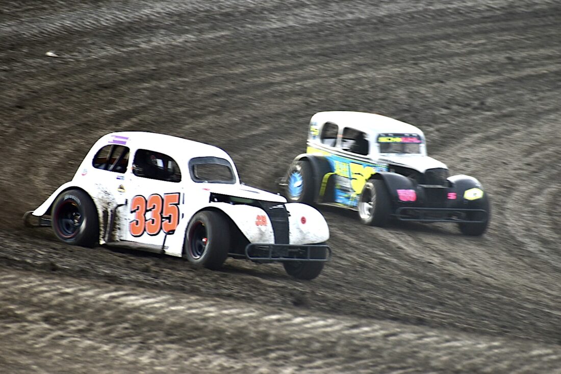 Nathan Beitler/MDN Beaux Miller of Bismarck, ND (335) races around the bend at Nodak Speedway during the Semi-Pro Legends Division hotlaps at the 29th annual Dirt Nationals on Saturday, Oct. 11.