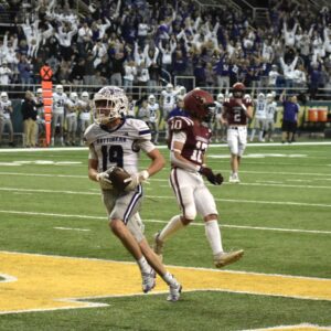 The Bottineau High School Braves fell to the first-seeded Langdon Area-Munich Cardinals 29-14, losing the Class A football state championship in their first state appearances in school history. Pictured is sophomore wide receiver Landyn Grant running the ball in for a touchdown in the first quarter of the championship match. Check Saturday’s paper for full game analysis.