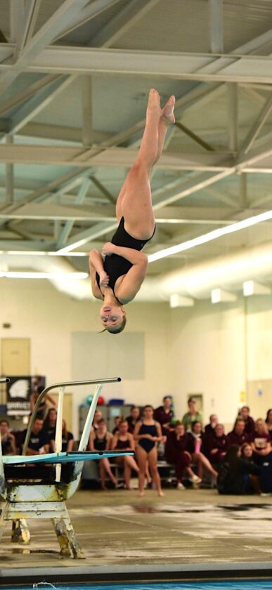 Submitted Photo Minot High diver Gracyn Bergan competes in the 1-meter diving event. Bergan won the WDA title with a score of 428.00 at the WDA Championship swimming and diving meet over the weekend at the Mandan Aquatics Center. Photo provided by the MHS swimming & diving team.