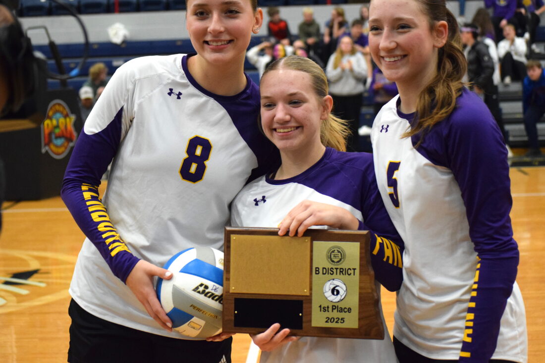 Mike Kraft/MDN Seniors Emma Jones (8), Sophie Cunningham (center) and Aubrie Quick (5) helped guide Glenburn to its first district championship in program history. The Panthers play Ray in the opening round of the Region 3 Tournament on Monday, Nov. 10, at the Minot Municipal Auditorium.