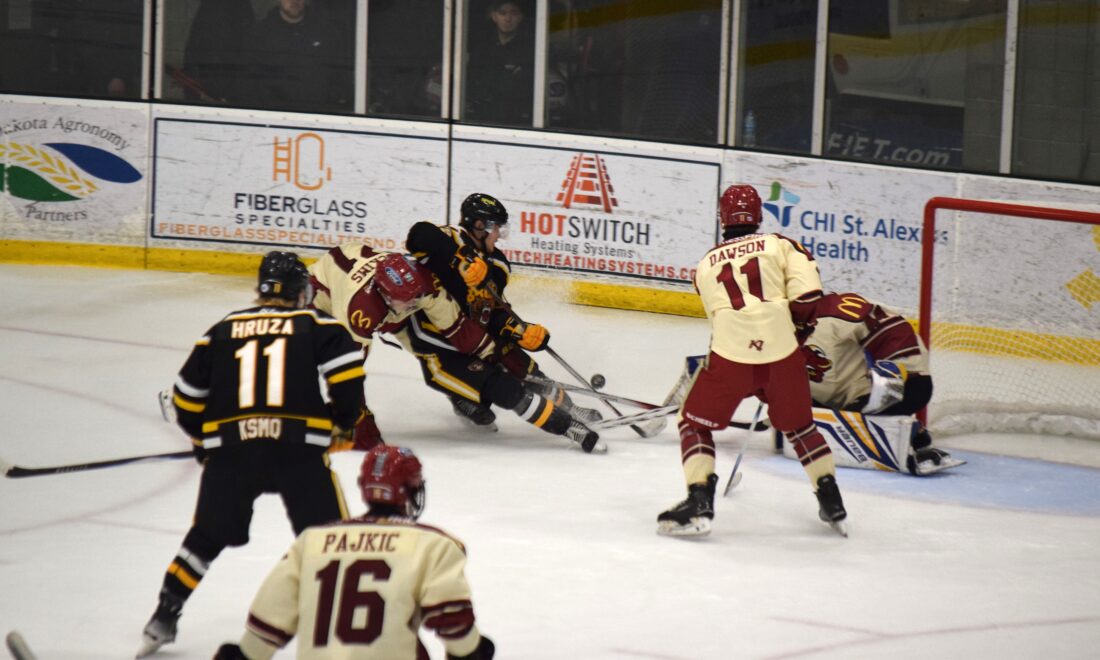 The Bruins surrendered four of the game’s first five goals, but scored six unanswered over a nearly 40-minute stretch to complete the comeback, earning a weekend sweep with a 7-5 victory over Minot at Maysa Arena on Saturday, Nov. 22.