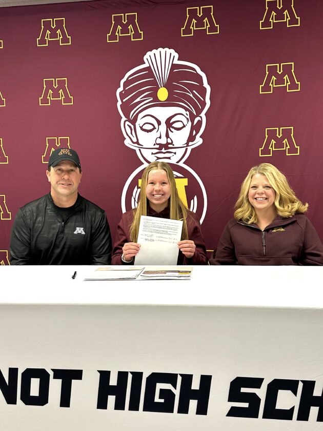 Submitted Photo Minot High girls tennis player and Our Redeemer’s student Kyllie Fettig signed her letter of intent to play for Minnesota Crookston next season during a press conference at Cameron Courts on Saturday, Dec. 13. Photo provided by Scott DeLorme/Minot High Tennis