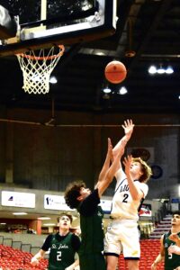 Nathan Beitler/MDN Bishop Ryan senior Jack Passa takes a jump shot in the Lions’ Monday night, Dec. 29, game against the St. John High School Woodchucks as part of the Dale Brown-Hoopster Classic at the Minot State Dome.