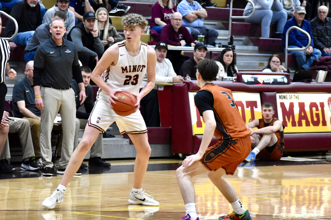 MDN FIle Photo Minot High junior Oakley Trueblood looks to pass the ball in a Magi’s past match up home game against Dickinson on Tuesday, Jan. 13.
