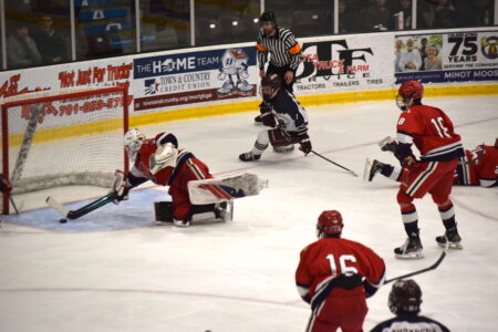 Minot United took the wind out of Century’s sails with a late tally in the second period to build a 3-0 advantage going into the second intermission. Following a failed clear out of the zone by the Patriots, a floating puck off the stick of Keller Schmeichel hit off Backes in front and went right to Landin Slind, who quickly snapped a shot short-side with 1:41 left in the middle stanza.