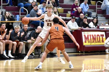 While her defensive prowess was again on display in the Knights’ non-district contest against Powers Lake-Burke Central, it was Olson’s offense that provided a much-needed spark for the home team.