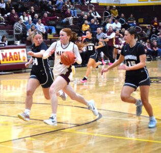 Minot High took full advantage of Mandan’s foul issues. Trailing 18-15, the Majettes scored their next 12 points from the charity stripe to take a 27-20 lead. Eve Knutson was 5-for-5 from the line during that stretch, including three after getting fouled attempting a shot from distance.