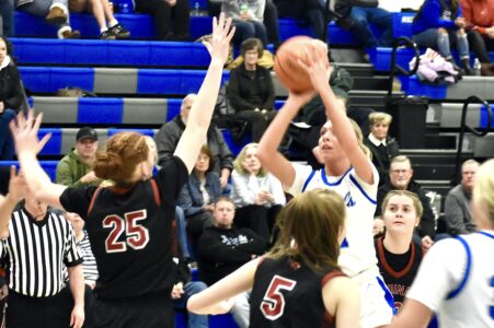 Nathan Beitler/MDN Skotti Beck, senior guard on the South Prairie-Max Royals girls basketball team (center right) jumps to shoot the ball past one of the defenders in their home game against the Nedrose Cardinals on Monday night, February 2.