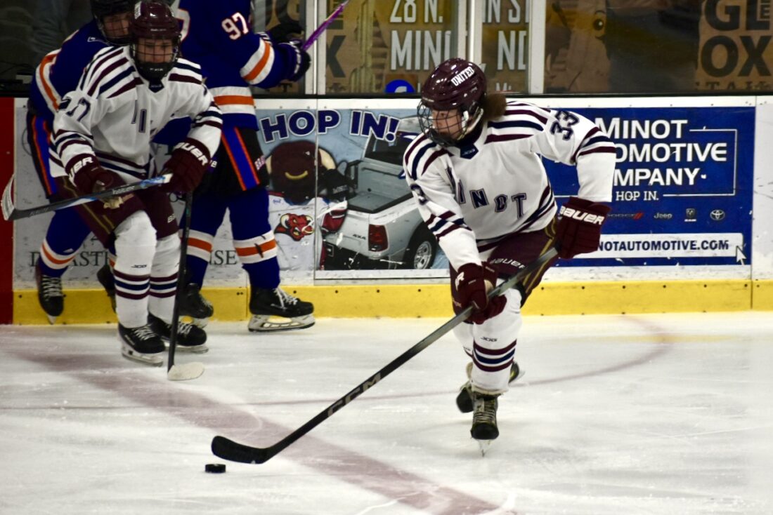 Minot United received goal contributions from five different skaters. Senior forward Oliver Thompson recorded a goal and two assists to extend his point streak to 22 games. Minot United won all three meetings with Williston this season.