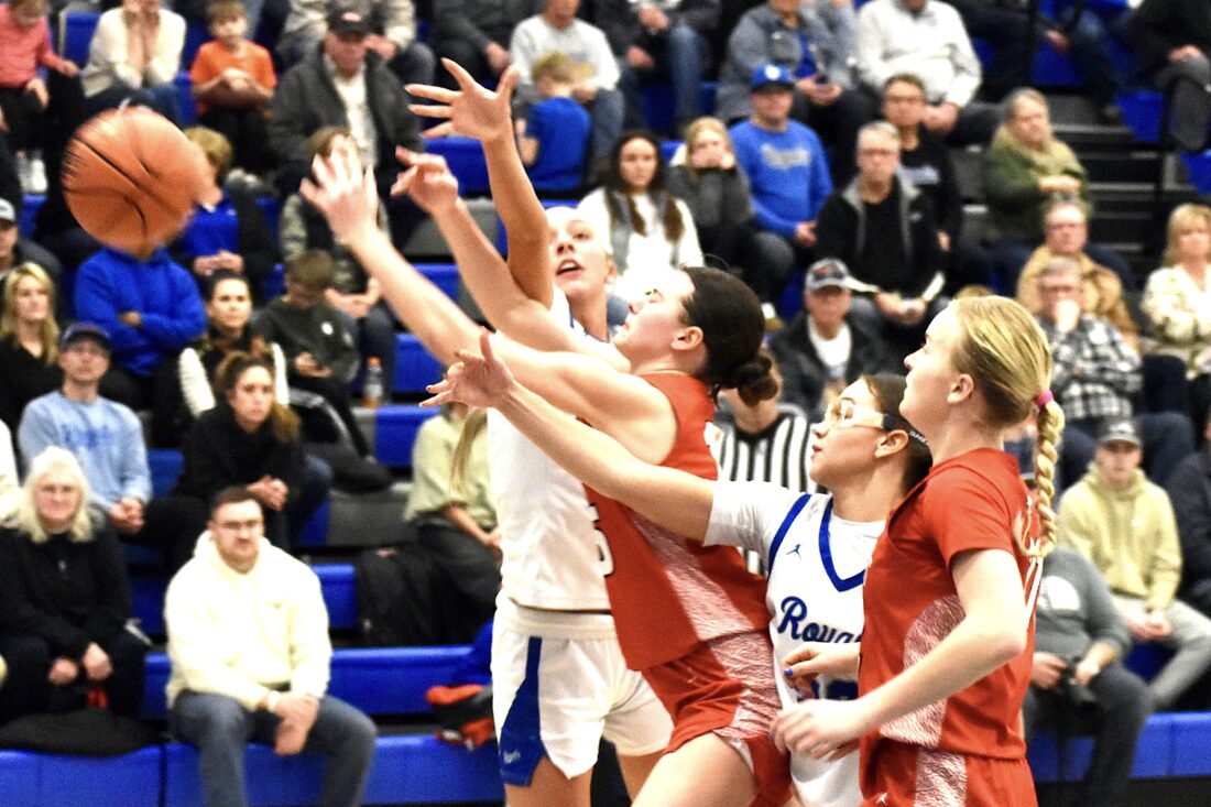 Nathan Beitler/MDN South Prairie-Max seniors Skotti Beck (center) and Brianna Rose (center-right) block a shot made by a member of the Devils Lake Firebirds in their home game on Tuesday, Feb. 3.