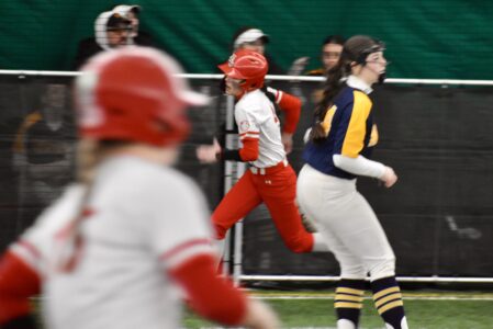 File photo of Minot State senior Micaela Resler (center) as she rounds third base to score off of an RBI by senior Paige Kellogg in the Beavers’ second game of their doubleheader against Montana State University Billings at home on Friday, Jan. 30. Nathan Beitler/MDN