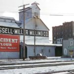 The mill was part of downtown Minot’s industrial district, named to the National Register of Historic Places in 1986. The tracks of Minot’s two railroads form rough boundaries for the old industrial district. The Burlington Northern at the north edge of Minot’s Original Townsite and the Canadian Pacific, diagonally bisecting the Burlington Northern tracks from the southeast, served companies in an area around and between the railroads that extended east from about Main Street to the Souris River.