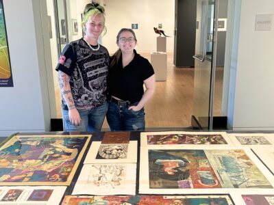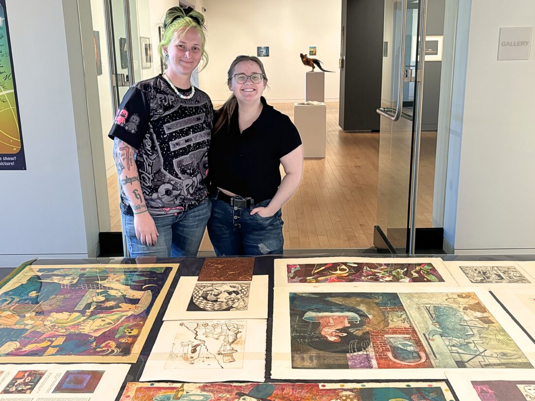 Angie Reinoehl/MDN Minot State University students Britt Rohn, left, and Kylie Anderson, right, played a role in obtaining original works created by master printmakers Michael Barnes and David Driesbach. Here they stand in front of MSU’s newly collected Driesbach pieces, which were donated by the artist’s family.