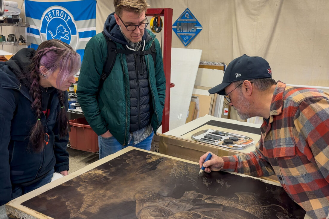 These donations were preceded by a research visit to Barnes’ in-home studio in Chicago and then to Northern Illinois University (NIU), where he is the current head of printmaking. On this trip, NAC Director Greg Vettel, MSU Professor Ryan Stander and art students Britt Rohn and Kylie Anderson got a behind-the-scenes look at Barnes’ process.