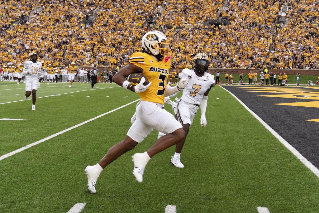Missouri wide receiver Luther Burden III (3) scores a touchdown past Vanderbilt safety Marlen Sewell, right, during the first quarter of an NCAA college football game Saturday, Sept. 21, 2024, in Columbia, Mo. (AP Photo/L.G. Patterson)