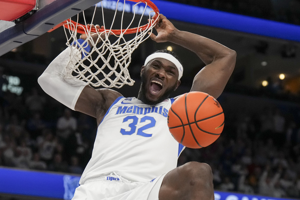 Memphis center Moussa Cisse (32) dunks the ball during the first half of an NCAA college basketball game against Mississippi, Saturday, Dec. 28, 2024, in Memphis, Tenn. (AP Photo/George Walker IV)