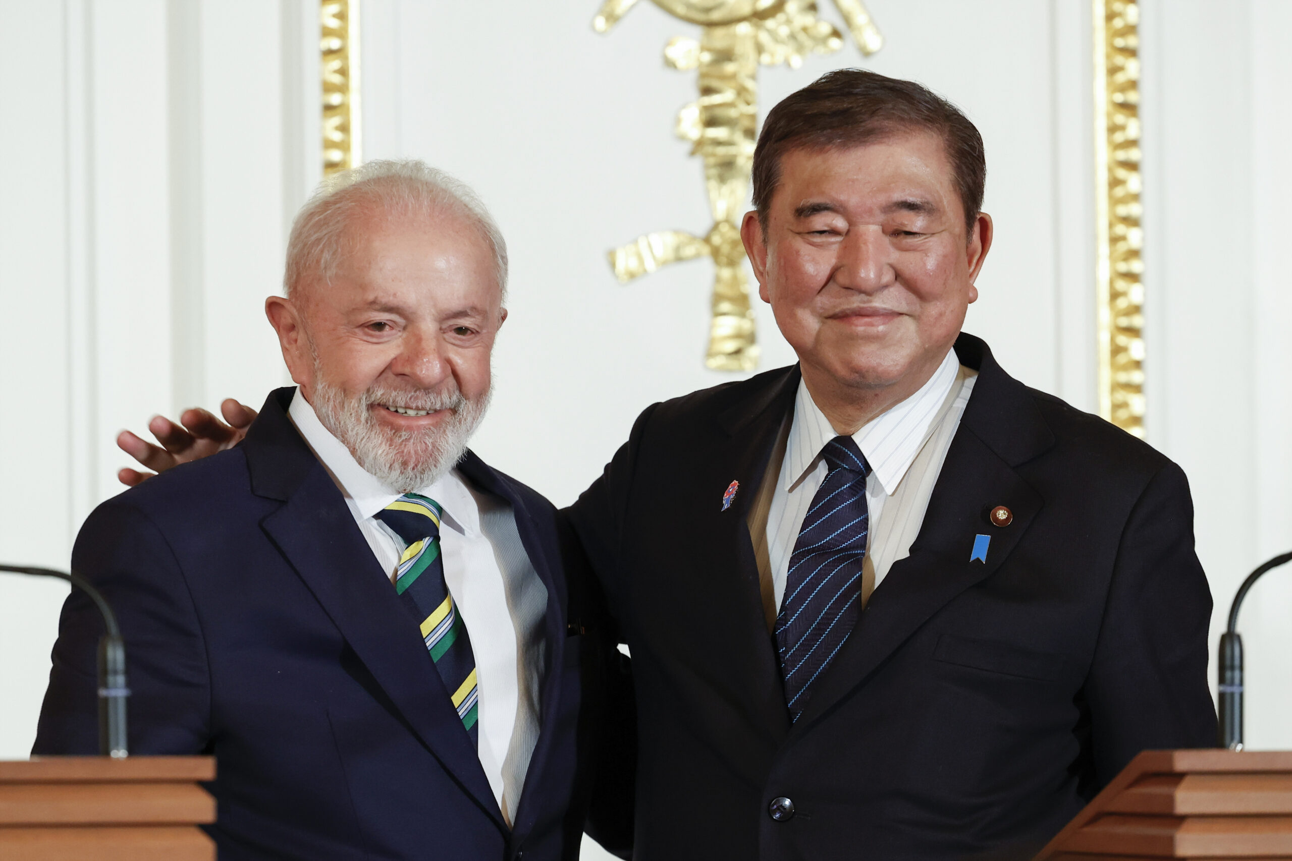 Brazilian President Luiz Inacio Lula da Silva, left, and Japanese Prime Minister Shigeru Ishiba pose for the cameras after ending a joint press conference at the Akasaka Palace State Guest House in Tokyo, Wednesday, March 26, 2025. (Rodrigo Reyes Marin/Pool Photo via AP)