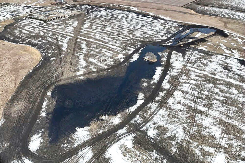 This image provided by South Bow shows a spill from the Keystone oil pipeline that occurred Tuesday, April 8, 2025 near Fort Ransom, N.D. (South Bow via AP)
