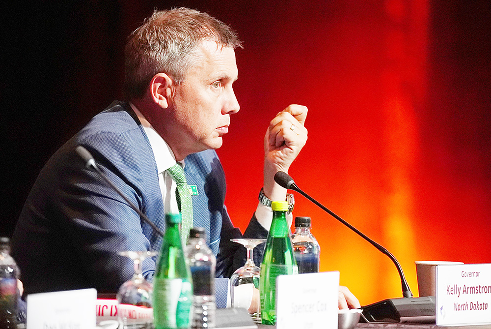FILE - North Dakota Governor Kelly Armstrong listens to Mark Cuban as he speaks greets during the summer meeting of the National Governors Association at the Broadmoor Hotel in Colorado Springs, Colo., July 25, 2025. (AP Photo/David Zalubowski, File)